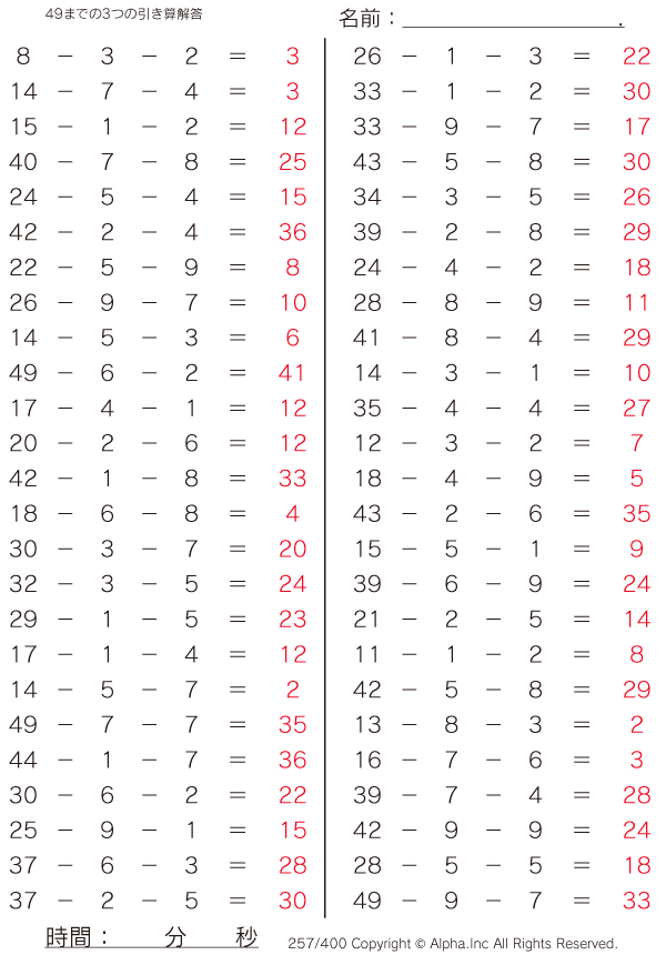 上記のボタンから「49までの3つの引き算」の算数数学ドリル・計算ドリル(PDFプリント)がダウンロードできます。個人利用は無料です(家庭以外での配布は有料です)。