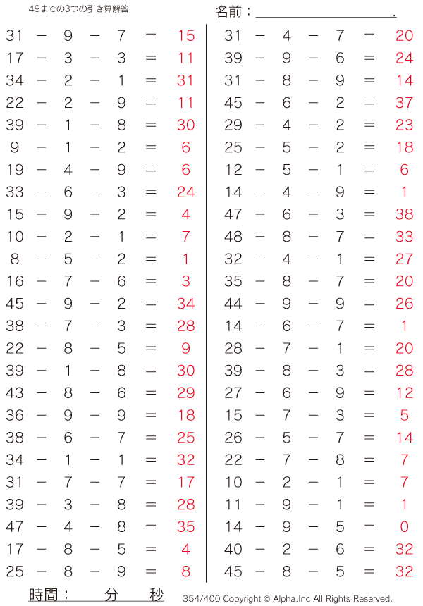 上記のボタンから「49までの3つの引き算」の算数数学ドリル・計算ドリル(PDFプリント)がダウンロードできます。個人利用は無料です(家庭以外での配布は有料です)。