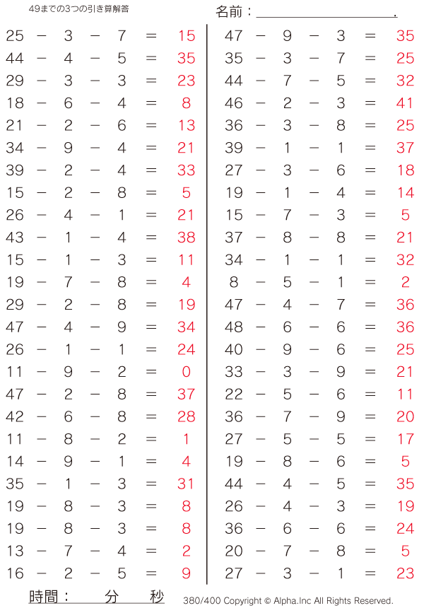 上記のボタンから「49までの3つの引き算」の算数数学ドリル・計算ドリル(PDFプリント)がダウンロードできます。個人利用は無料です(家庭以外での配布は有料です)。