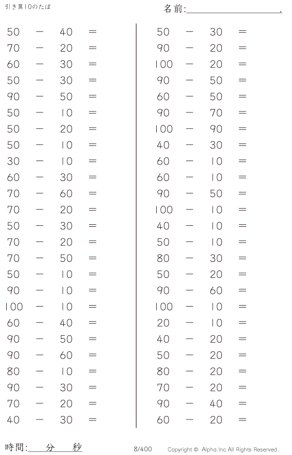 上記のボタンから「引き算10のたば(100まで)」の算数数学ドリル・計算ドリル(PDFプリント)がダウンロードできます。個人利用は無料です(家庭以外での配布は有料です)。