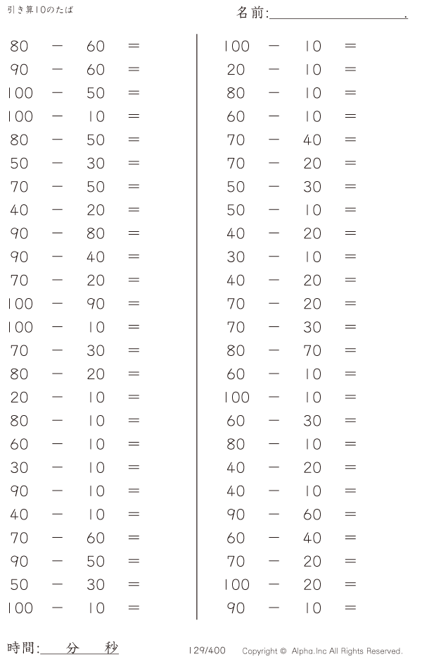 上記のボタンから「引き算10のたば(100まで)」の算数数学ドリル・計算ドリル(PDFプリント)がダウンロードできます。個人利用は無料です(家庭以外での配布は有料です)。