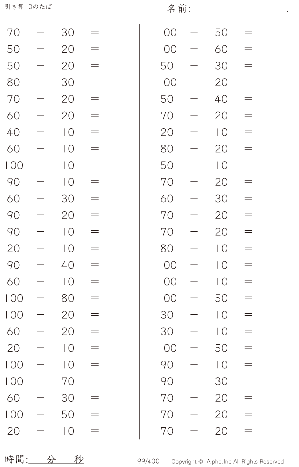 上記のボタンから「引き算10のたば(100まで)」の算数数学ドリル・計算ドリル(PDFプリント)がダウンロードできます。個人利用は無料です(家庭以外での配布は有料です)。