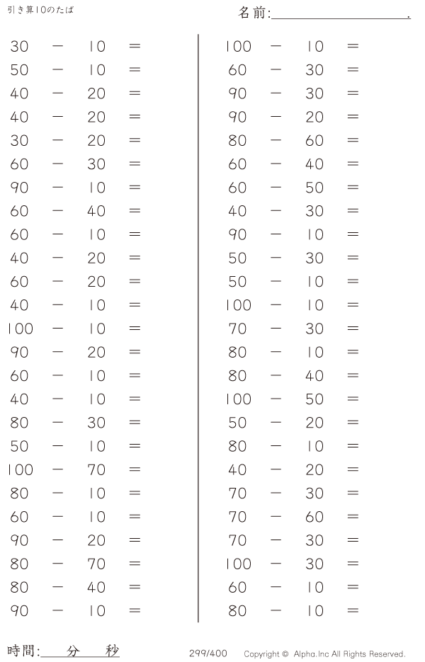 上記のボタンから「引き算10のたば(100まで)」の算数数学ドリル・計算ドリル(PDFプリント)がダウンロードできます。個人利用は無料です(家庭以外での配布は有料です)。