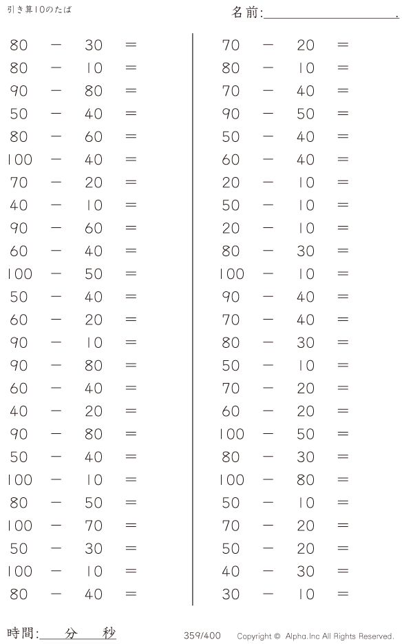 上記のボタンから「引き算10のたば(100まで)」の算数数学ドリル・計算ドリル(PDFプリント)がダウンロードできます。個人利用は無料です(家庭以外での配布は有料です)。
