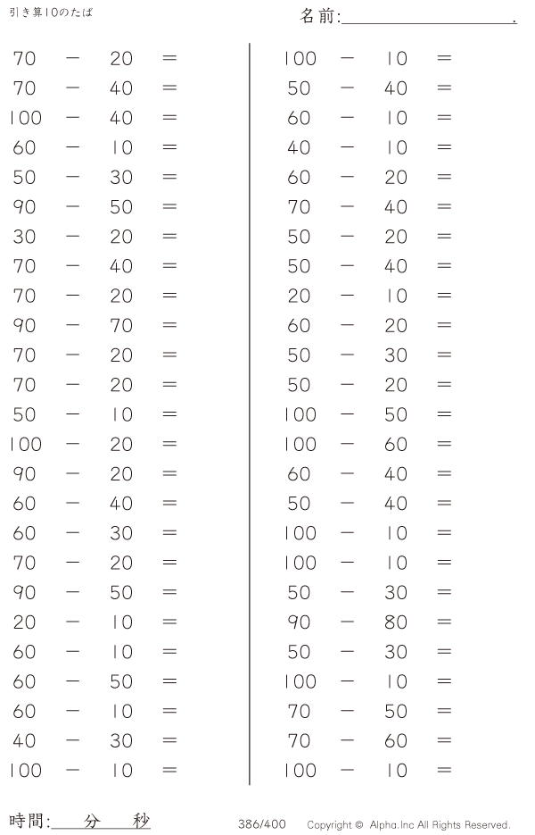 上記のボタンから「引き算10のたば(100まで)」の算数数学ドリル・計算ドリル(PDFプリント)がダウンロードできます。個人利用は無料です(家庭以外での配布は有料です)。