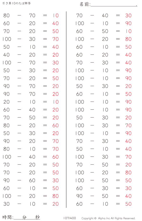 引き算10のたば(100まで)の問題解答ガイド