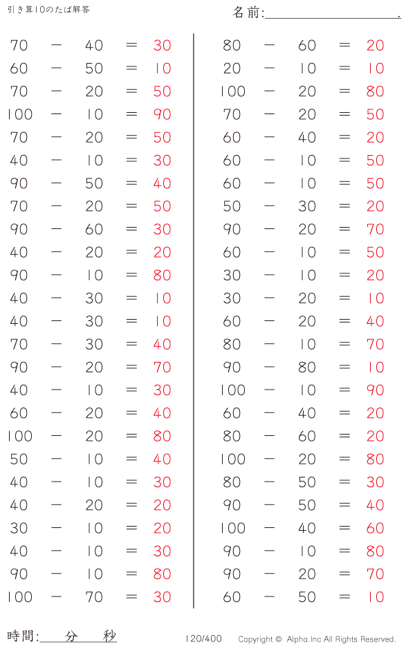 上記のボタンから「引き算10のたば(100まで)」の算数数学ドリル・計算ドリル(PDFプリント)がダウンロードできます。個人利用は無料です(家庭以外での配布は有料です)。