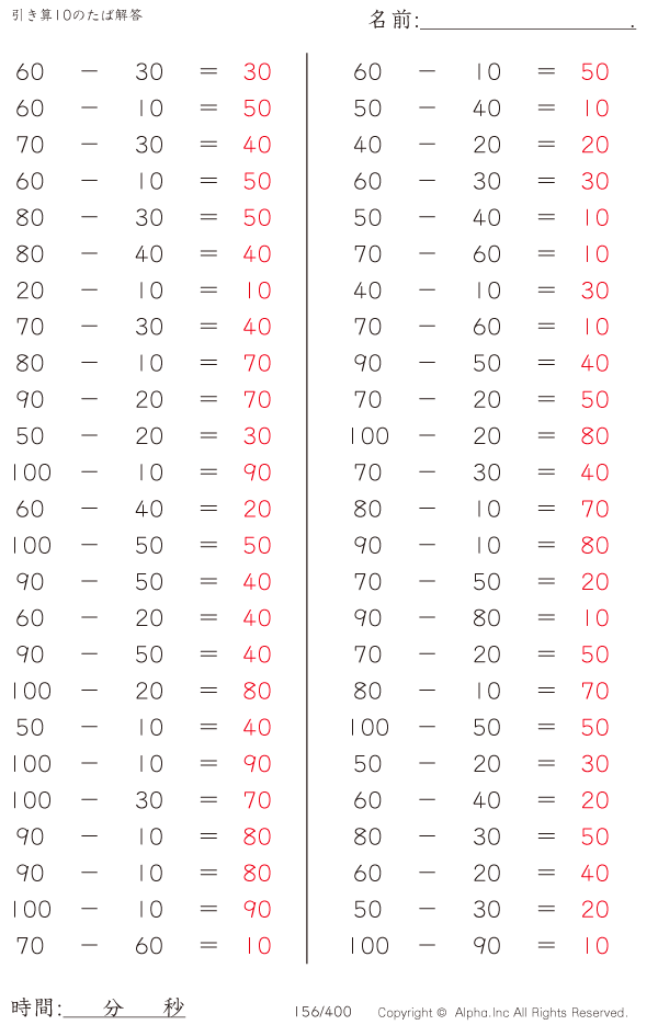 引き算10のたば(100まで)の問題解答ガイド
