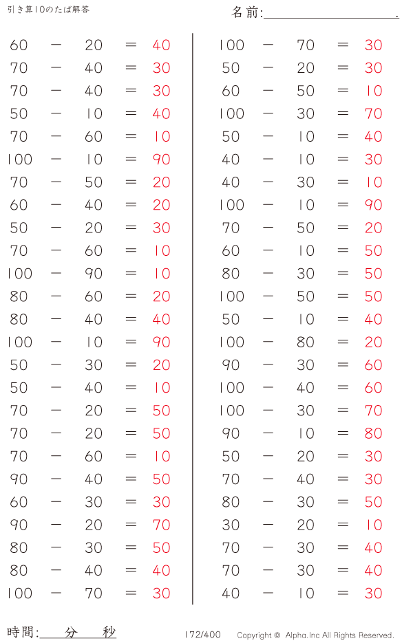 上記のボタンから「引き算10のたば(100まで)」の算数数学ドリル・計算ドリル(PDFプリント)がダウンロードできます。個人利用は無料です(家庭以外での配布は有料です)。