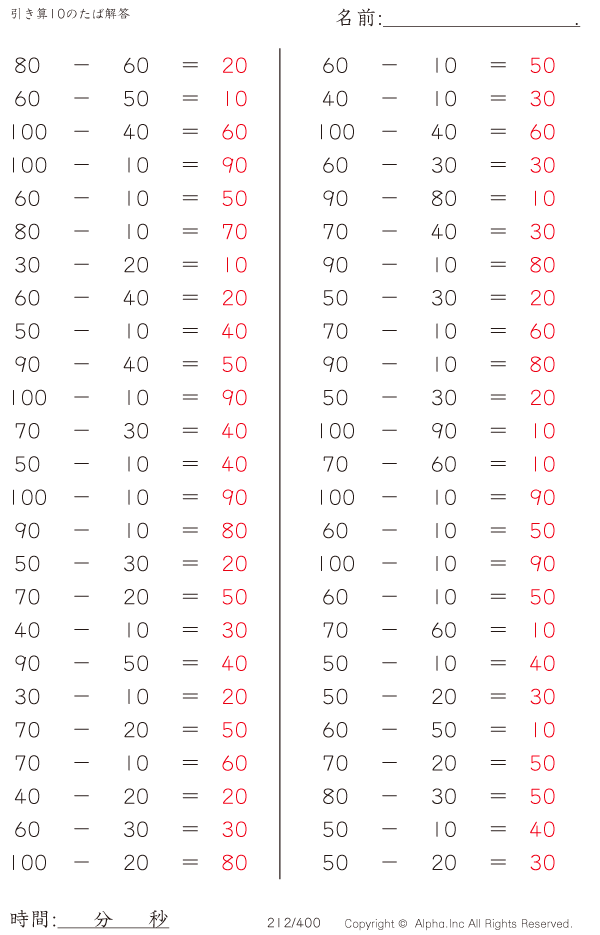 引き算10のたば(100まで)の問題解答ガイド
