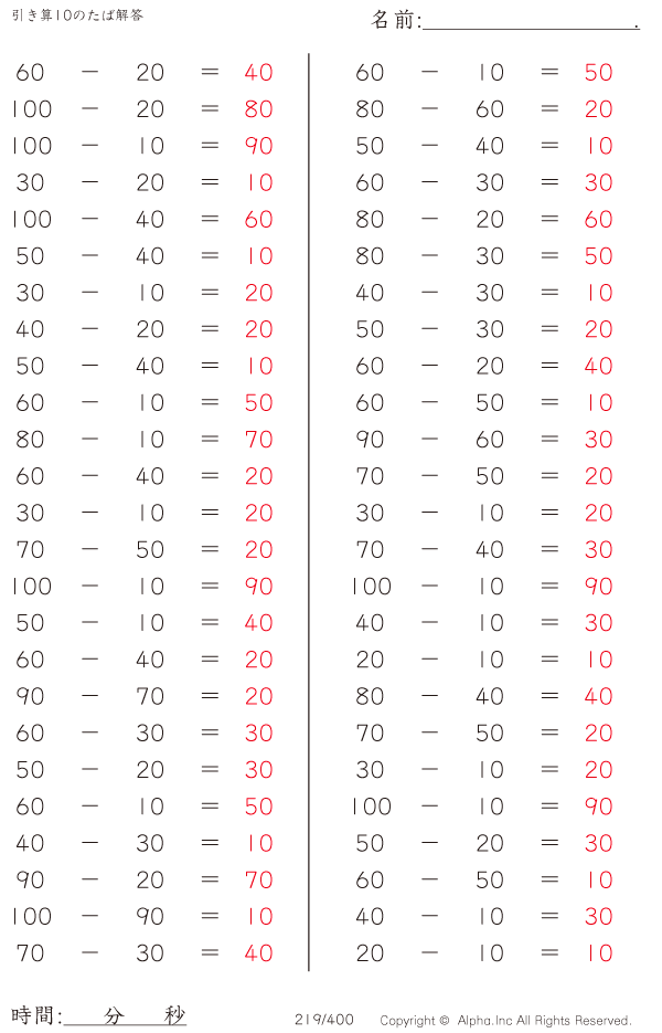 上記のボタンから「引き算10のたば(100まで)」の算数数学ドリル・計算ドリル(PDFプリント)がダウンロードできます。個人利用は無料です(家庭以外での配布は有料です)。