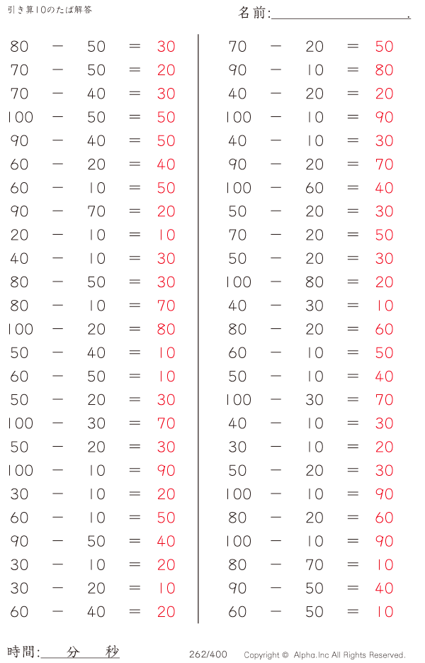 上記のボタンから「引き算10のたば(100まで)」の算数数学ドリル・計算ドリル(PDFプリント)がダウンロードできます。個人利用は無料です(家庭以外での配布は有料です)。