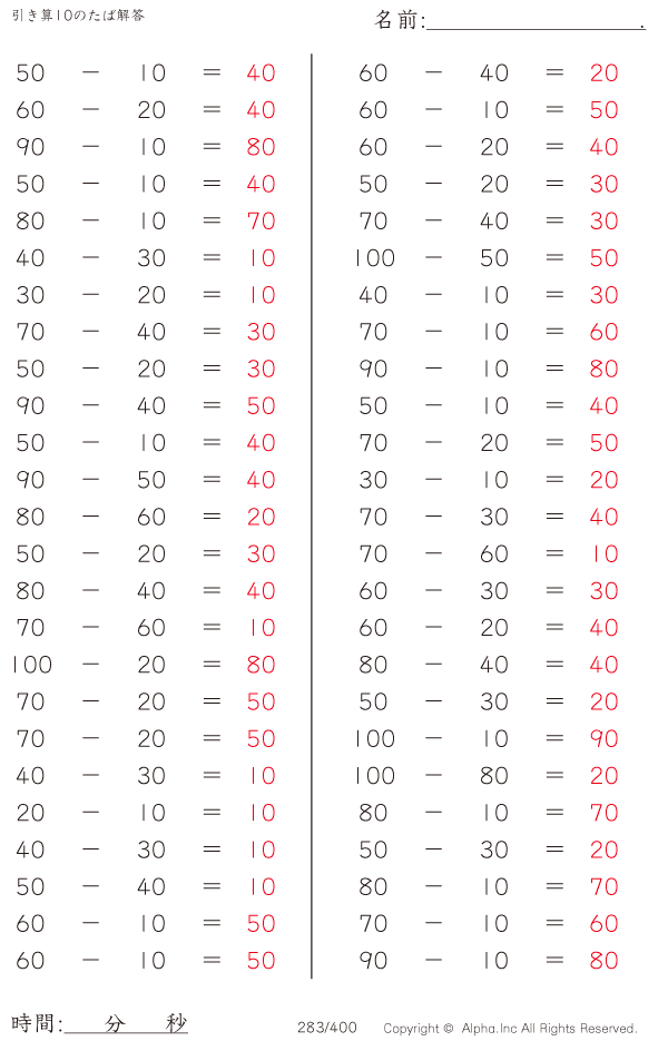 上記のボタンから「引き算10のたば(100まで)」の算数数学ドリル・計算ドリル(PDFプリント)がダウンロードできます。個人利用は無料です(家庭以外での配布は有料です)。