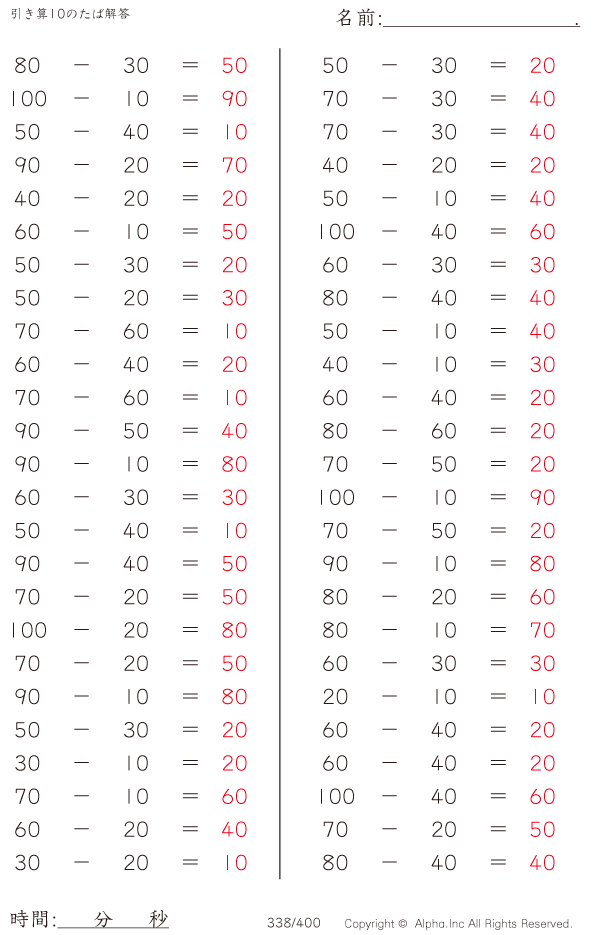 上記のボタンから「引き算10のたば(100まで)」の算数数学ドリル・計算ドリル(PDFプリント)がダウンロードできます。個人利用は無料です(家庭以外での配布は有料です)。