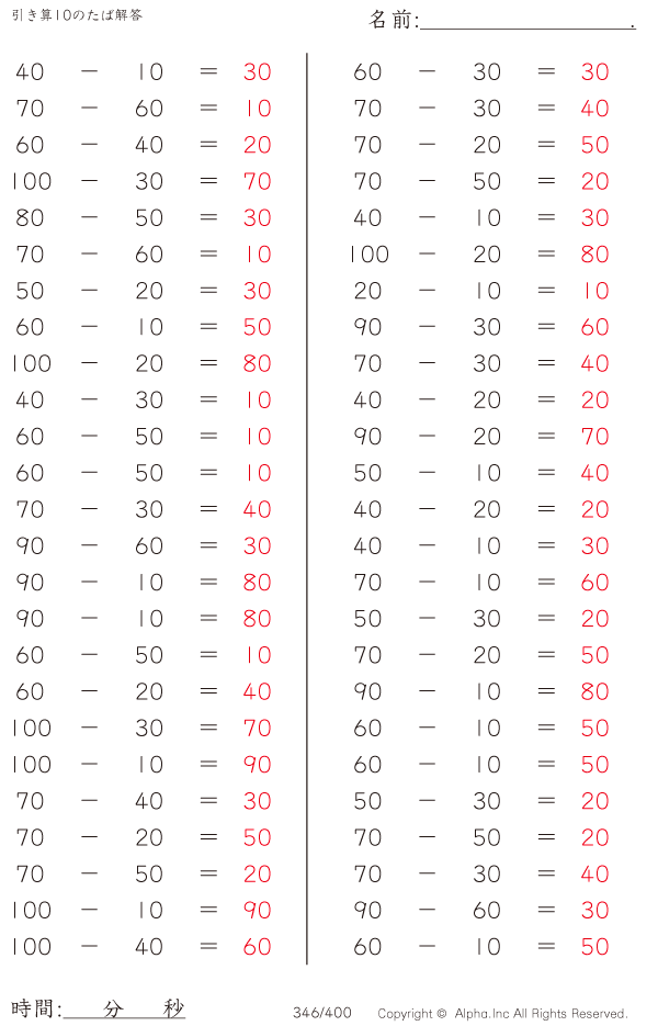 上記のボタンから「引き算10のたば(100まで)」の算数数学ドリル・計算ドリル(PDFプリント)がダウンロードできます。個人利用は無料です(家庭以外での配布は有料です)。