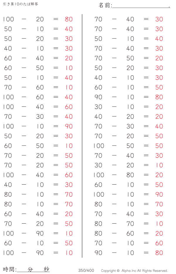 引き算10のたば(100まで) [解答]350/400