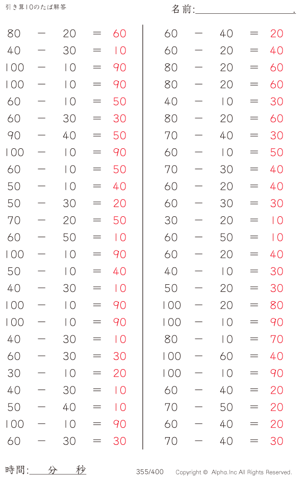 引き算10のたば(100まで) [解答]355/400