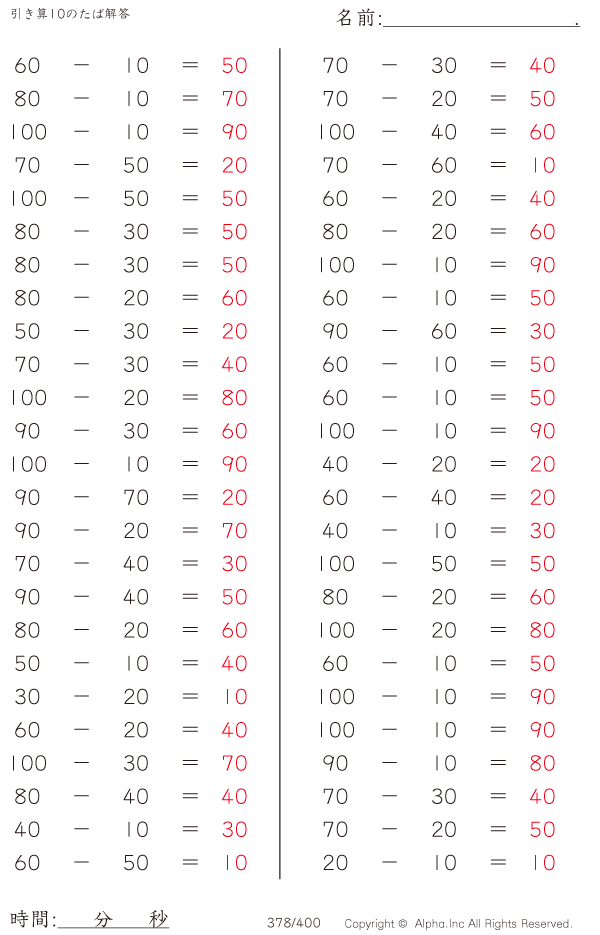 上記のボタンから「引き算10のたば(100まで)」の算数数学ドリル・計算ドリル(PDFプリント)がダウンロードできます。個人利用は無料です(家庭以外での配布は有料です)。