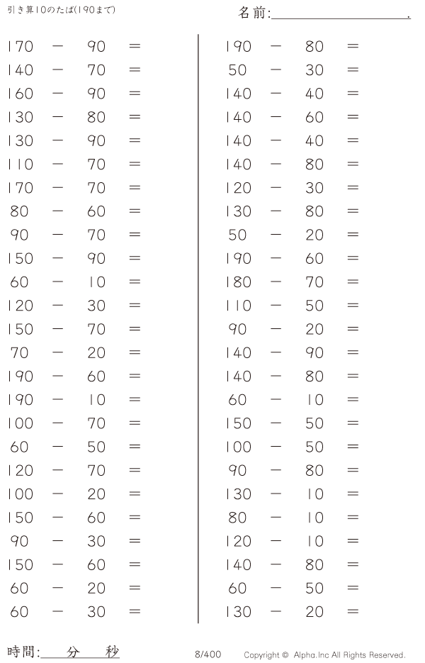 上記のボタンから「引き算10のたば(190まで)」の算数数学ドリル・計算ドリル(PDFプリント)がダウンロードできます。個人利用は無料です(家庭以外での配布は有料です)。