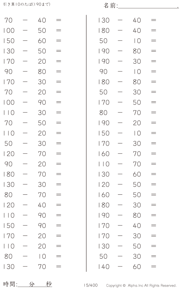上記のボタンから「引き算10のたば(190まで)」の算数数学ドリル・計算ドリル(PDFプリント)がダウンロードできます。個人利用は無料です(家庭以外での配布は有料です)。