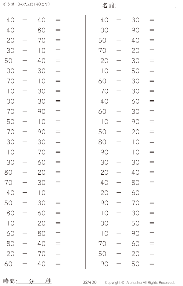 引き算10のたば(190まで) [問題]032/400