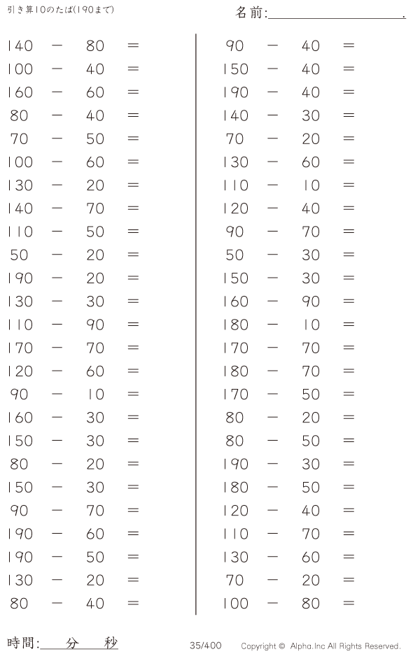 引き算10のたば(190まで) [問題]035/400