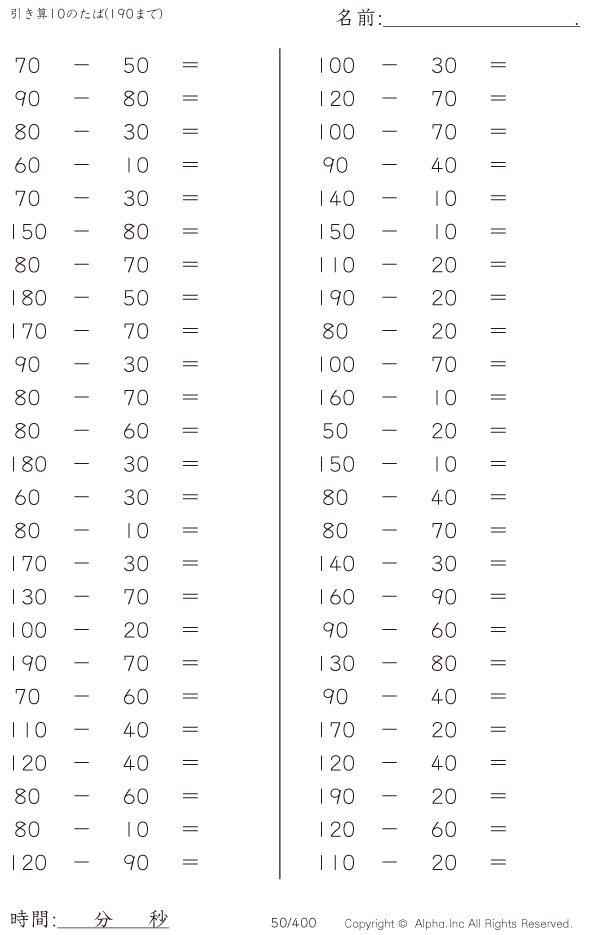 引き算10のたば(190まで) [問題]050/400