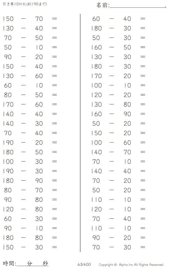 上記のボタンから「引き算10のたば(190まで)」の算数数学ドリル・計算ドリル(PDFプリント)がダウンロードできます。個人利用は無料です(家庭以外での配布は有料です)。