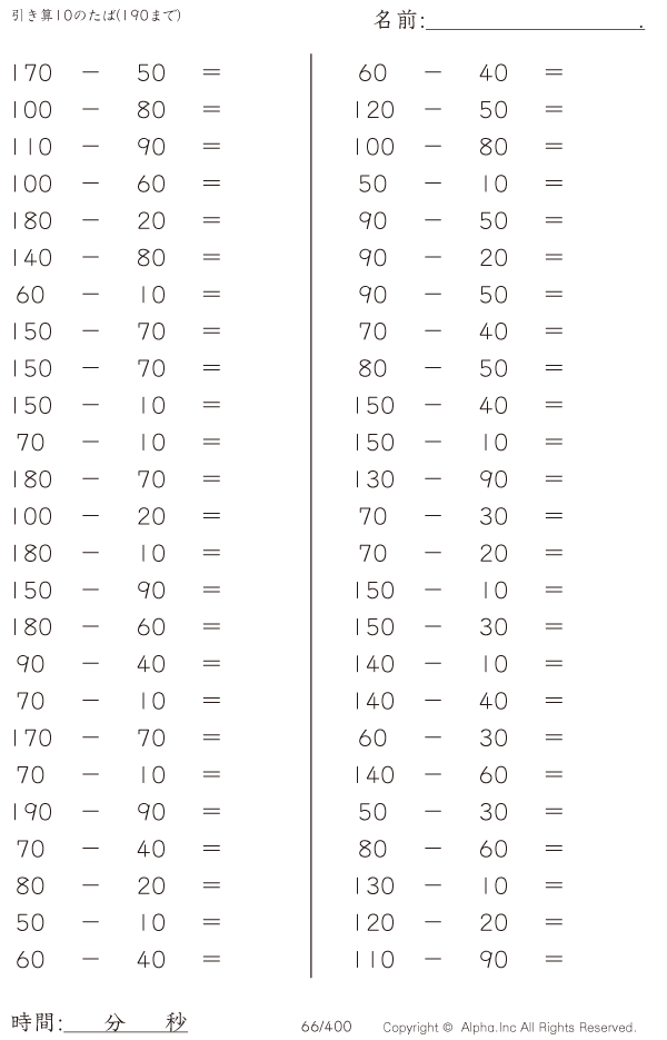 上記のボタンから「引き算10のたば(190まで)」の算数数学ドリル・計算ドリル(PDFプリント)がダウンロードできます。個人利用は無料です(家庭以外での配布は有料です)。
