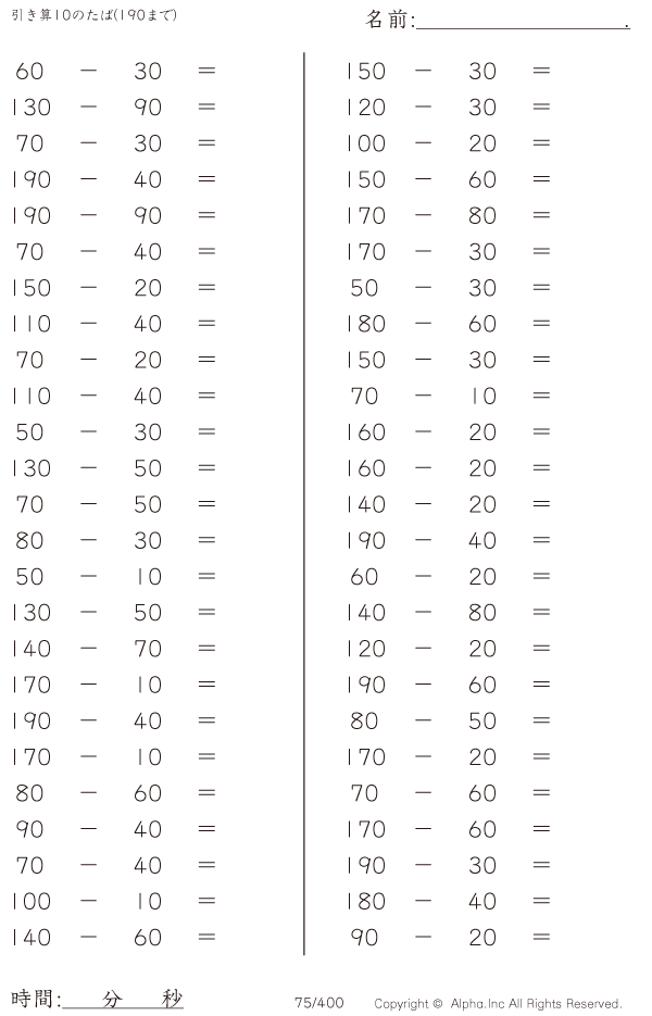 上記のボタンから「引き算10のたば(190まで)」の算数数学ドリル・計算ドリル(PDFプリント)がダウンロードできます。個人利用は無料です(家庭以外での配布は有料です)。