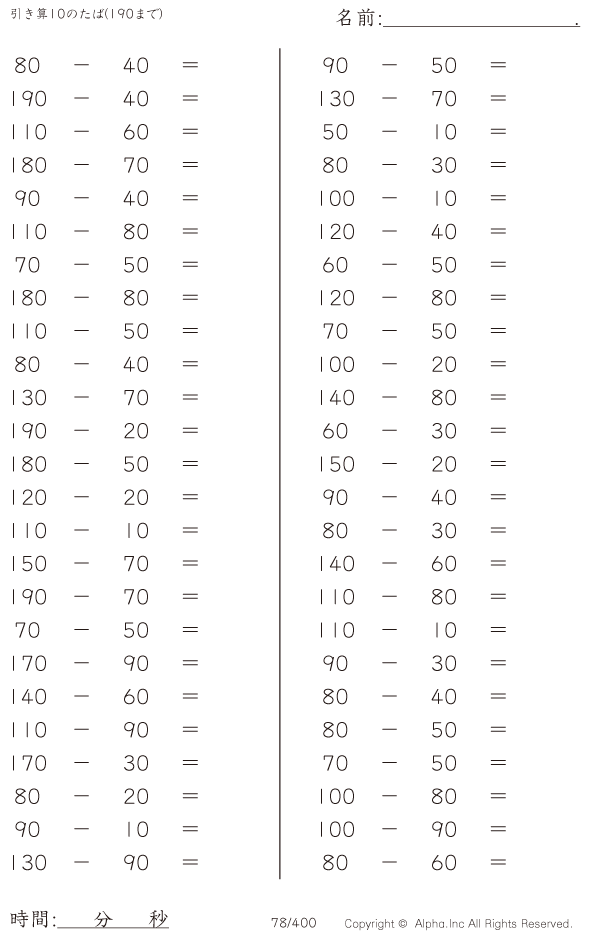 上記のボタンから「引き算10のたば(190まで)」の算数数学ドリル・計算ドリル(PDFプリント)がダウンロードできます。個人利用は無料です(家庭以外での配布は有料です)。