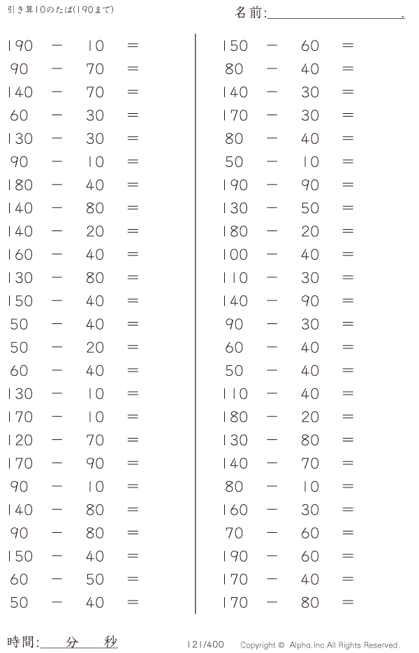 引き算10のたば(190まで) [問題]121/400