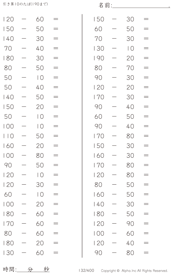 上記のボタンから「引き算10のたば(190まで)」の算数数学ドリル・計算ドリル(PDFプリント)がダウンロードできます。個人利用は無料です(家庭以外での配布は有料です)。
