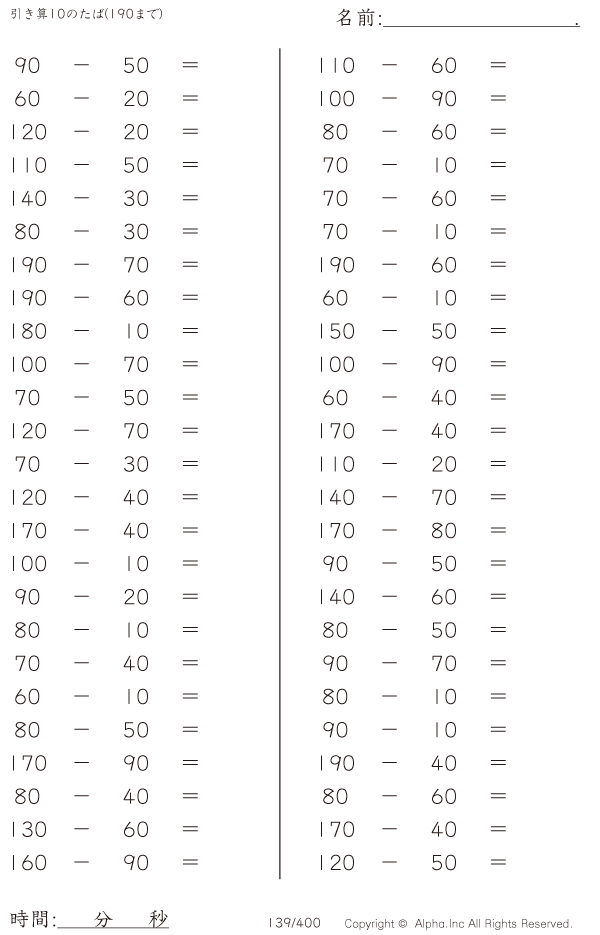 引き算10のたば(190まで) [問題]139/400