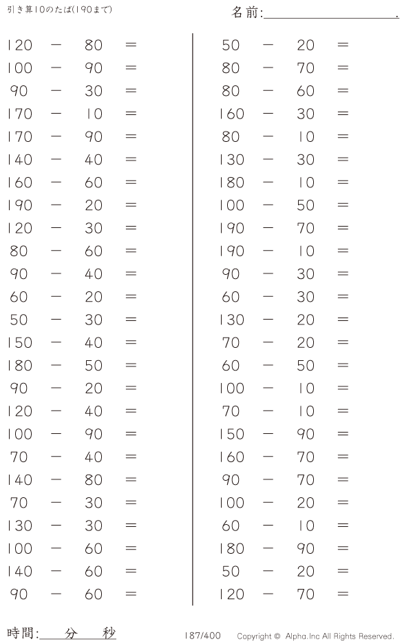 上記のボタンから「引き算10のたば(190まで)」の算数数学ドリル・計算ドリル(PDFプリント)がダウンロードできます。個人利用は無料です(家庭以外での配布は有料です)。