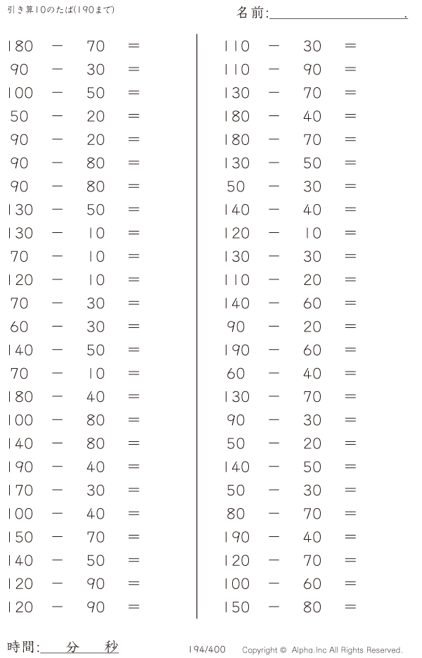 上記のボタンから「引き算10のたば(190まで)」の算数数学ドリル・計算ドリル(PDFプリント)がダウンロードできます。個人利用は無料です(家庭以外での配布は有料です)。