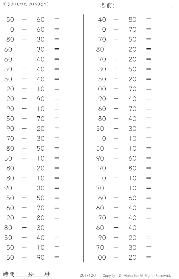 上記のボタンから「引き算10のたば(190まで)」の算数数学ドリル・計算ドリル(PDFプリント)がダウンロードできます。個人利用は無料です(家庭以外での配布は有料です)。