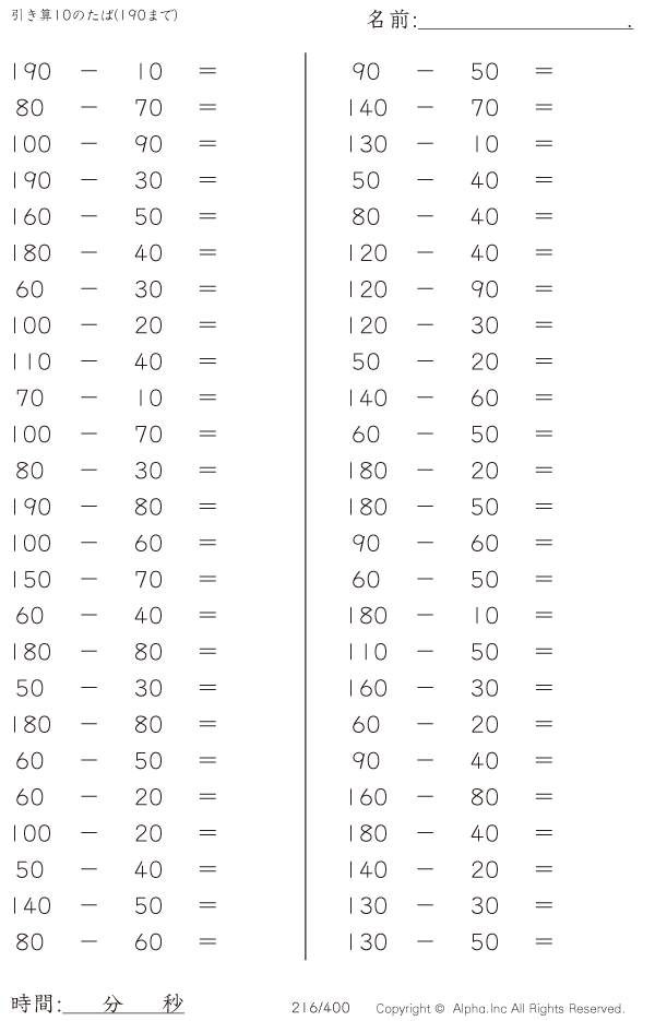 上記のボタンから「引き算10のたば(190まで)」の算数数学ドリル・計算ドリル(PDFプリント)がダウンロードできます。個人利用は無料です(家庭以外での配布は有料です)。