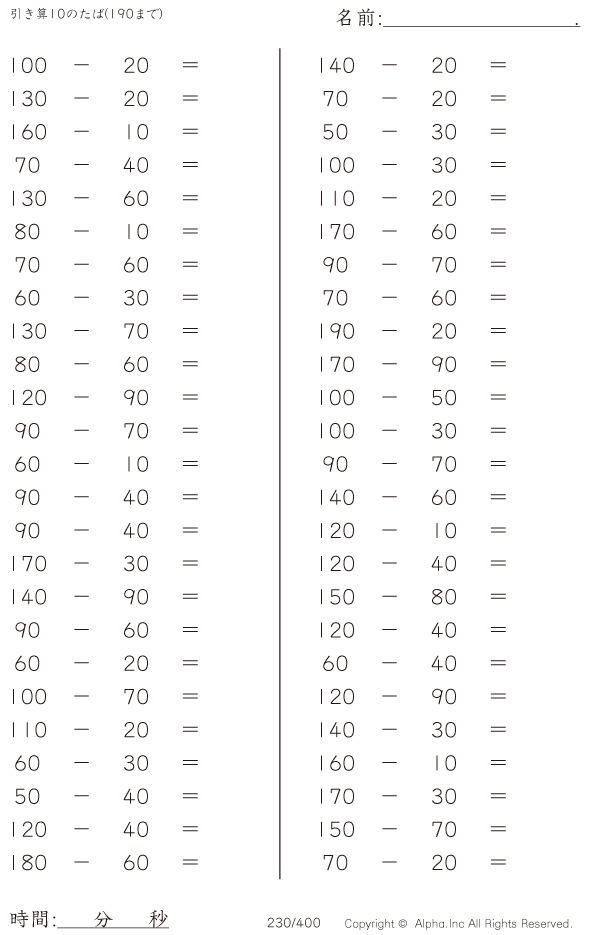 上記のボタンから「引き算10のたば(190まで)」の算数数学ドリル・計算ドリル(PDFプリント)がダウンロードできます。個人利用は無料です(家庭以外での配布は有料です)。