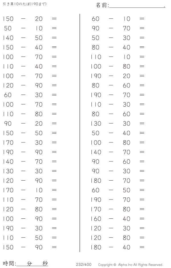 上記のボタンから「引き算10のたば(190まで)」の算数数学ドリル・計算ドリル(PDFプリント)がダウンロードできます。個人利用は無料です(家庭以外での配布は有料です)。