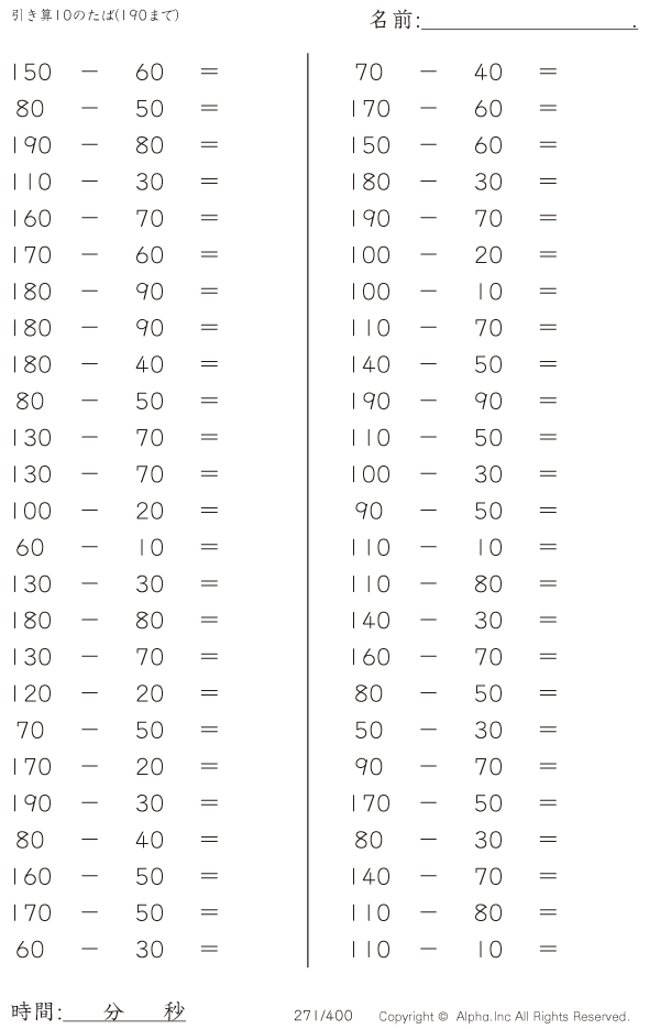 上記のボタンから「引き算10のたば(190まで)」の算数数学ドリル・計算ドリル(PDFプリント)がダウンロードできます。個人利用は無料です(家庭以外での配布は有料です)。