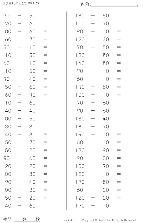 上記のボタンから「引き算10のたば(190まで)」の算数数学ドリル・計算ドリル(PDFプリント)がダウンロードできます。個人利用は無料です(家庭以外での配布は有料です)。