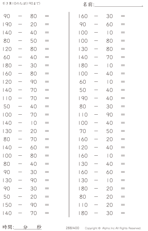 上記のボタンから「引き算10のたば(190まで)」の算数数学ドリル・計算ドリル(PDFプリント)がダウンロードできます。個人利用は無料です(家庭以外での配布は有料です)。