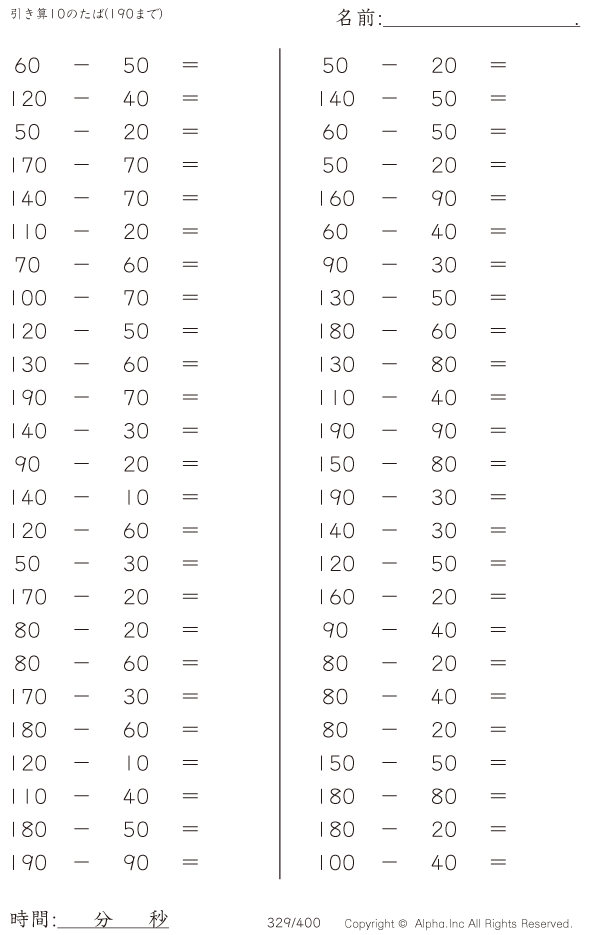 上記のボタンから「引き算10のたば(190まで)」の算数数学ドリル・計算ドリル(PDFプリント)がダウンロードできます。個人利用は無料です(家庭以外での配布は有料です)。