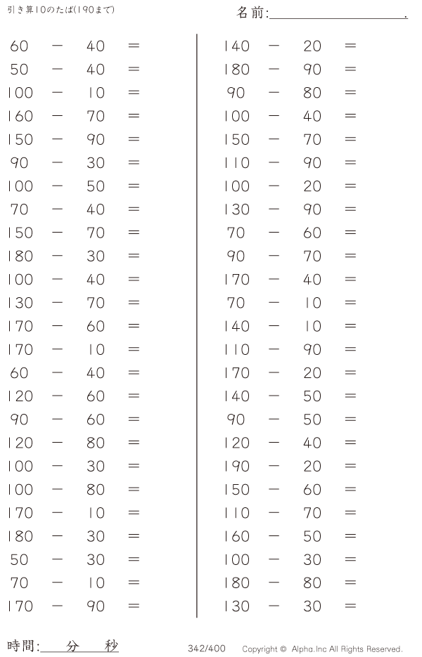 引き算10のたば(190まで) [問題]342/400