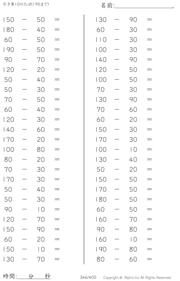 上記のボタンから「引き算10のたば(190まで)」の算数数学ドリル・計算ドリル(PDFプリント)がダウンロードできます。個人利用は無料です(家庭以外での配布は有料です)。