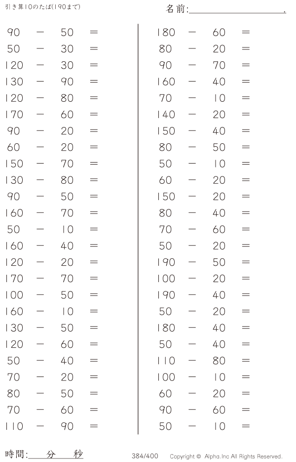 上記のボタンから「引き算10のたば(190まで)」の算数数学ドリル・計算ドリル(PDFプリント)がダウンロードできます。個人利用は無料です(家庭以外での配布は有料です)。