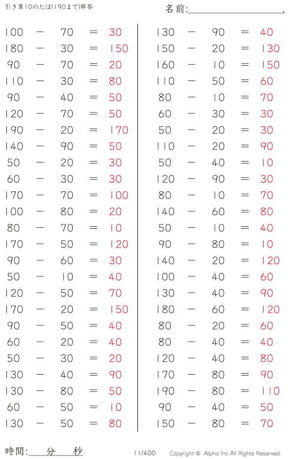 上記のボタンから「引き算10のたば(190まで)」の算数数学ドリル・計算ドリル(PDFプリント)がダウンロードできます。個人利用は無料です(家庭以外での配布は有料です)。