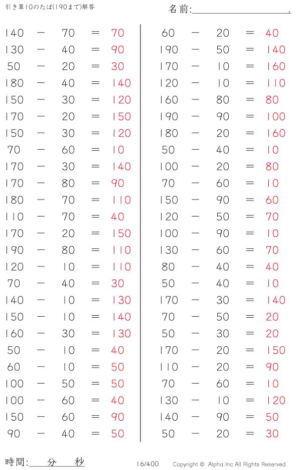 上記のボタンから「引き算10のたば(190まで)」の算数数学ドリル・計算ドリル(PDFプリント)がダウンロードできます。個人利用は無料です(家庭以外での配布は有料です)。