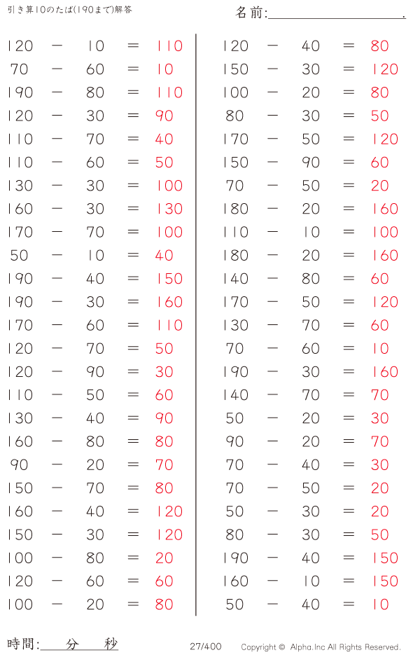 引き算10のたば(190まで) [解答]027/400